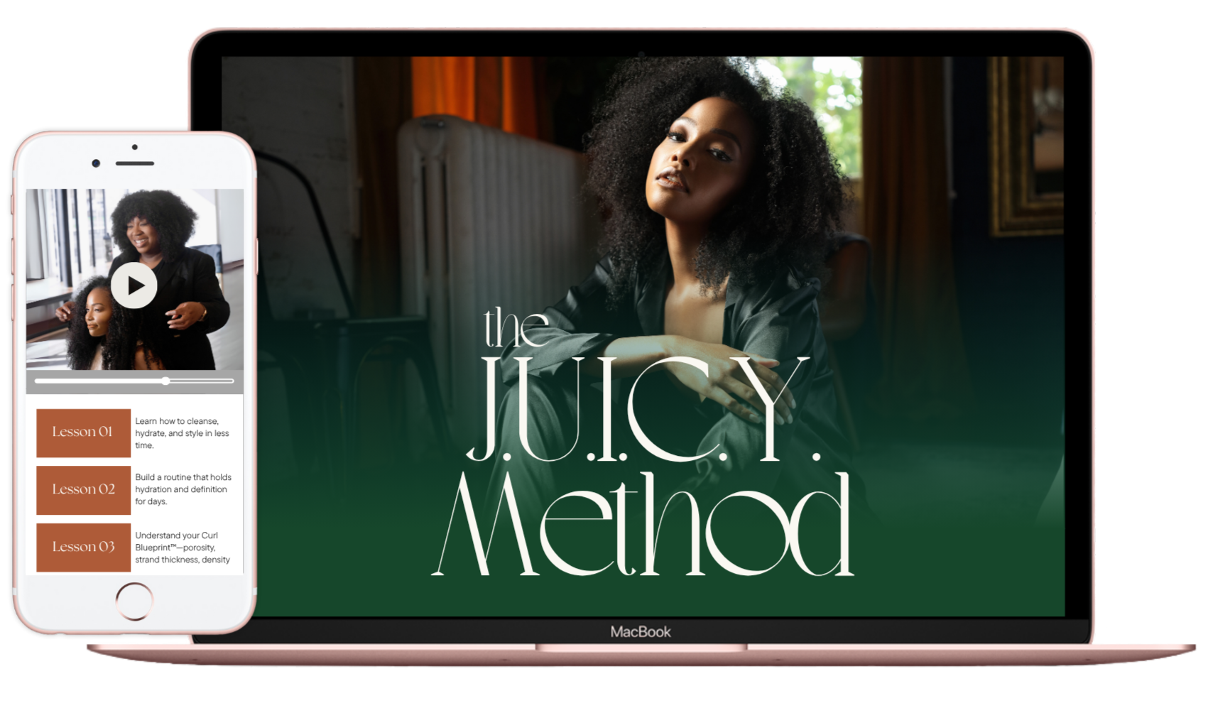 The JUICY Method is your step by step system to help you finally understand your curls, lock in moisture that lasts, and grow soft, healthy hair—without doing the most.